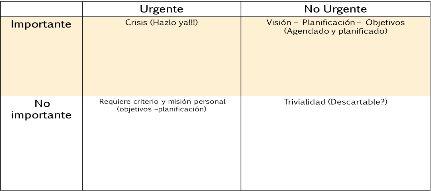 Importante – Urgente: Son aquellas actividades impostergables. ¿Una entrega de informe mañana? ¿una prueba en unas horas? Tu atención y recursos son demandados por la actividad. Cuando no has podido planificarlo adecuadamente, suelen ser actividades que te causan estrés.